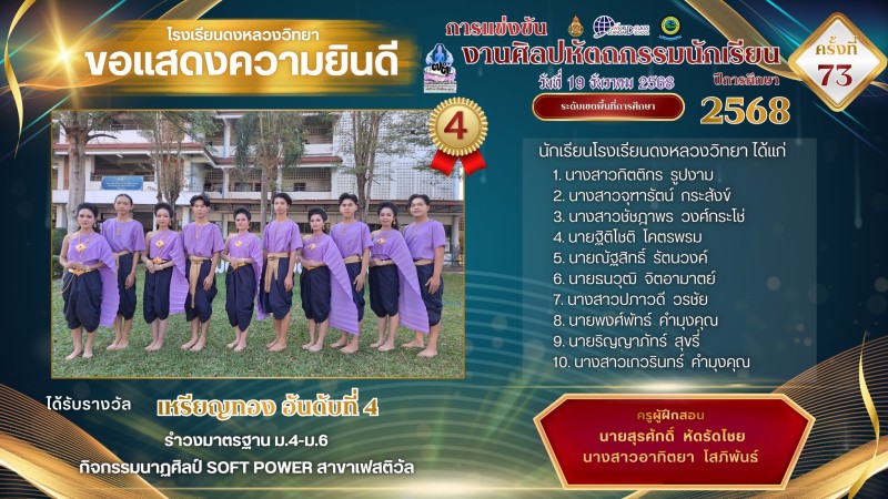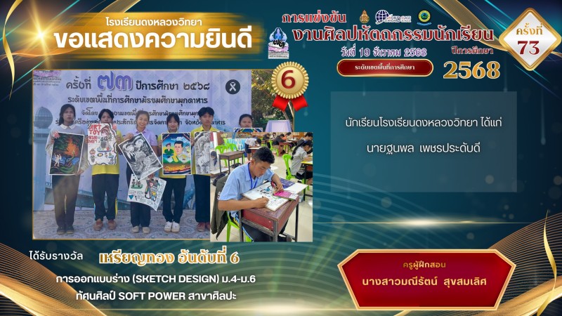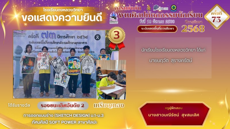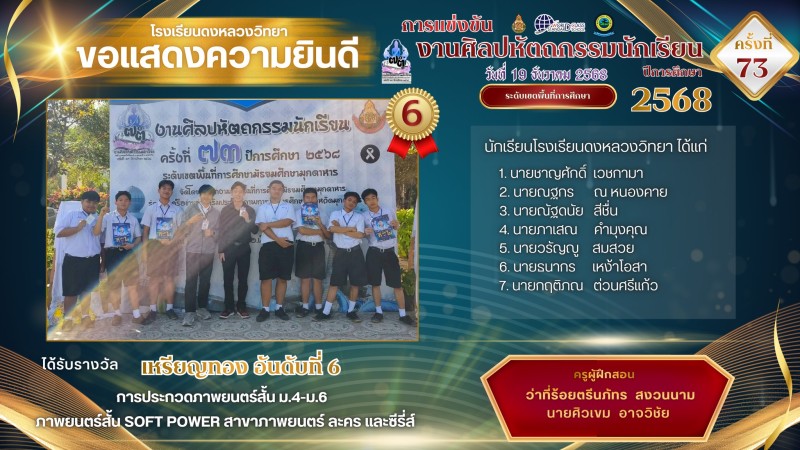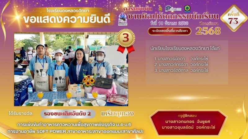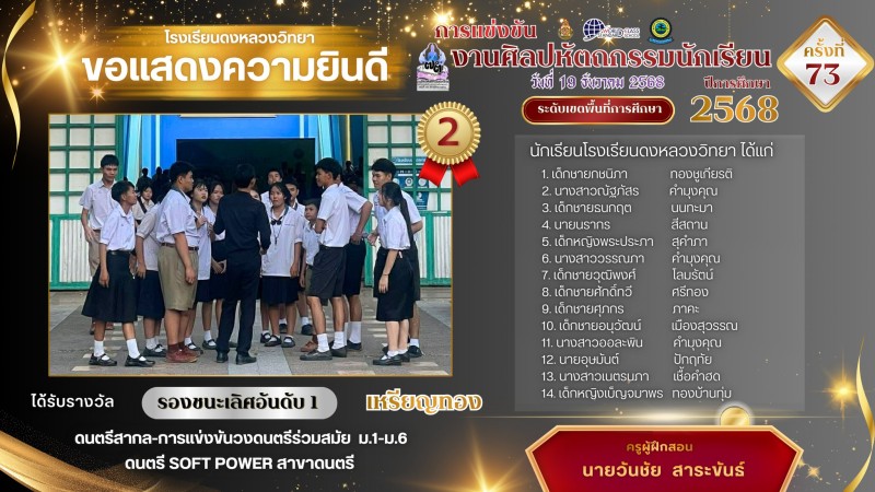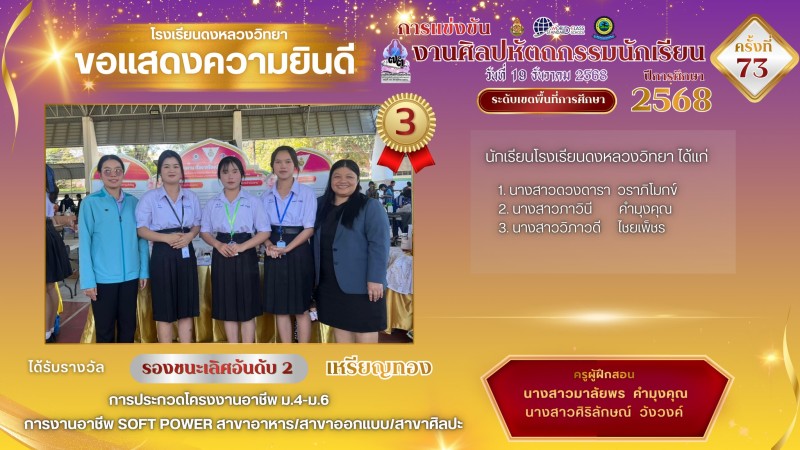 โรงเรียนดงหลวงวิทยาขอแสดงความยินดีและชื่นชมกับความสำเร็จของนักเรียนและครูผู้ฝึกสอนในทุกกิจกรรมการแข่งขันงานศิลปหัตถกรรมนักเรียน ครั้งที่ 73 จังหวัดมุกดาหาร ณ โรงเรียนมุกดาหาร