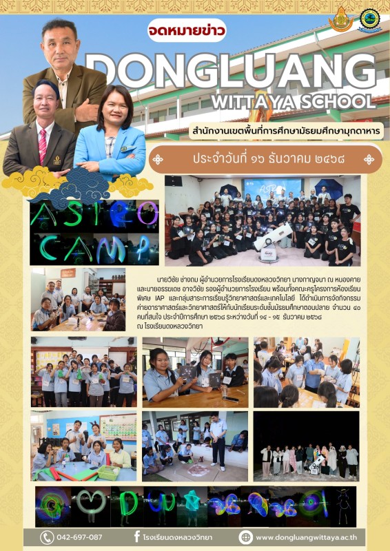 นายวิชัย ช่างถม ผู้อำนวยการโรงเรียนดงหลวงวิทยา นางกาญจนา ณ หนองคาย และนายอรรฆเดช อาจวิชัย รองผู้อำนวยการโรงเรียน พร้อมทั้งคณะครูโครงการห้องเรียนพิเศษ IAP และกลุ่มสาระการเรียนรู้วิทยาศาสตร์และเทคโนโลยี ได้ดำเนินการจัดกิจกรรมค่ายดาราศาสตร์และวิทยาศาสตร์ให้กับนักเรียนระดับชั้นมัธยมศึกษาตอนปลาย จำนวน ๔๐ คนที่สนใจ ประจำปีการศึกษา ๒๕๖๘ ระหว่างวันที่ ๑๔ - ๑๕ ธันวาคม ๒๕๖๘ ณ โรงเรียนดงหลวงวิทยา