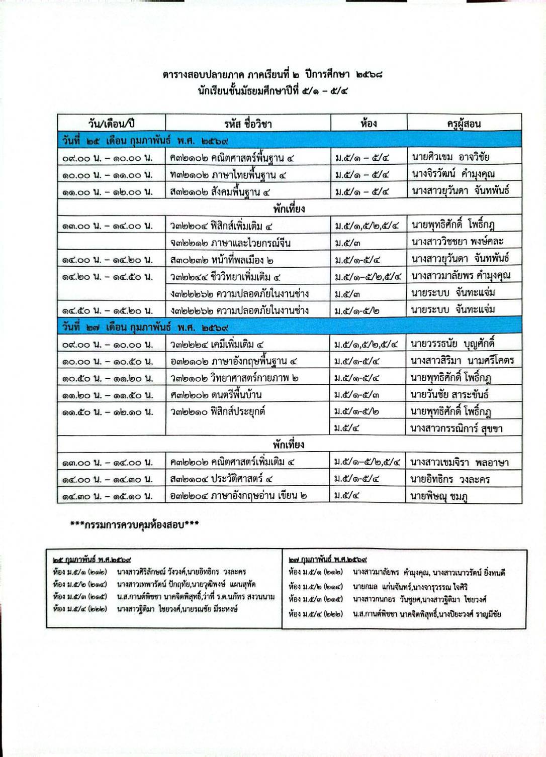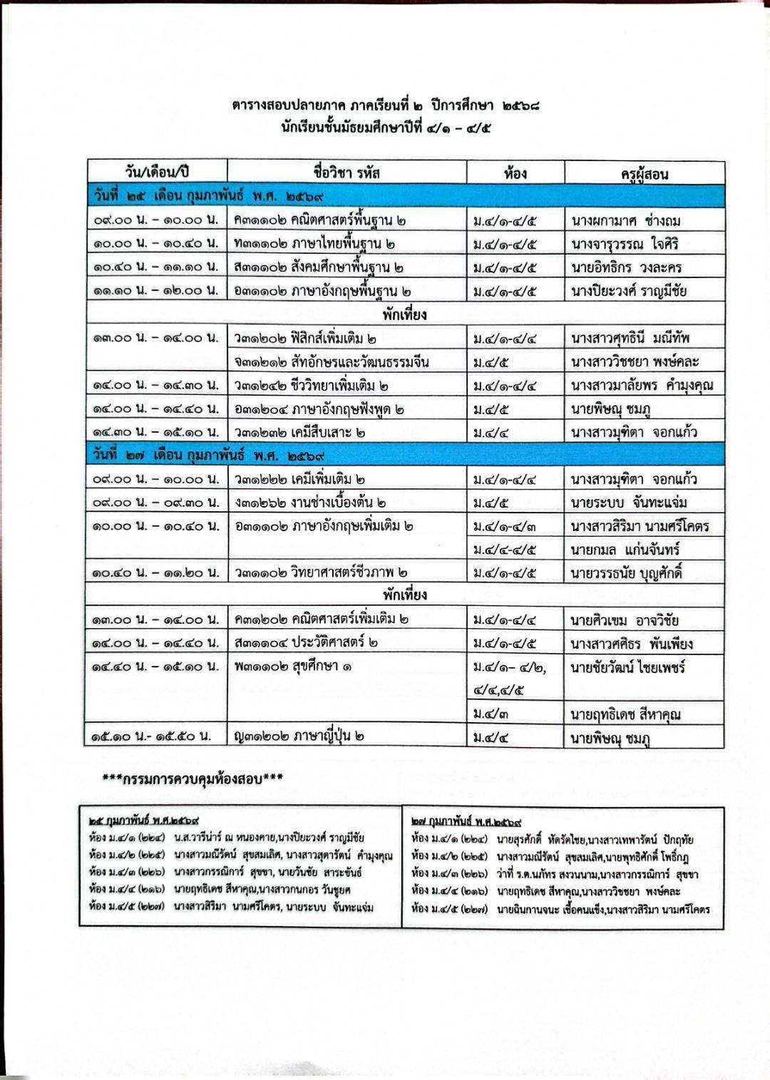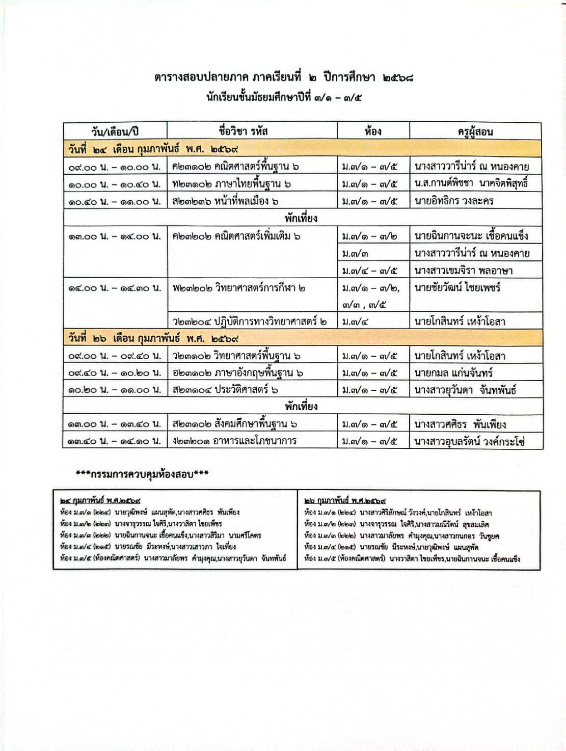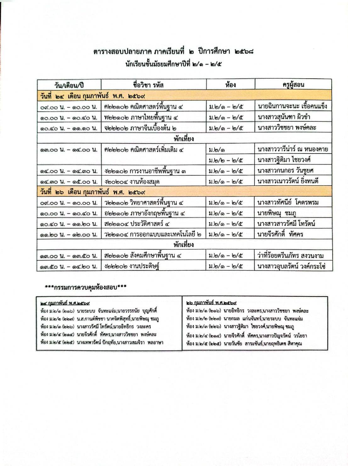 ตารางสอบปลายภาคเรียนที่ 2 ปีการศึกษา 2568
